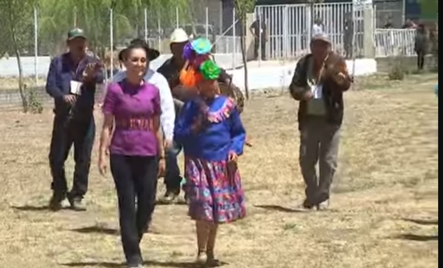 A la presidenta, que portó un vestido tradicional de la región, le acompañaron la secretaria de Bienestar, Ariadna Montiel; el director general del IMSS, Zoé Robledo; la directora de la Comisión Federal de Electricidad, María Esther Callejas; las autoridades tepehuanas Abraham Chaparro y Bertha Alicia Vega; así como Adelfo Regino Montes, director general del Instituto Nacional de Pueblos Indígenas, quien presentó un informe sobre el avance del Plan de Justicia para los Pueblos de la Sierra Tarahumara, que incluye construcción y acondicionamiento de caminos y electrificación de comunidades.