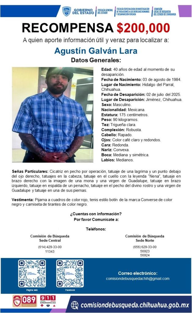 La Fiscalía de Distrito Zona Sur a través de la Unidad Especializada en Investigación de Personas No Localizadas y Desaparecidas, continúa con los trabajos de búsqueda para dar con el paradero de Agustín Galván Lara, quien fue reportado como desaparecido el 02 de julio del presente año en el municipio de Jiménez.
