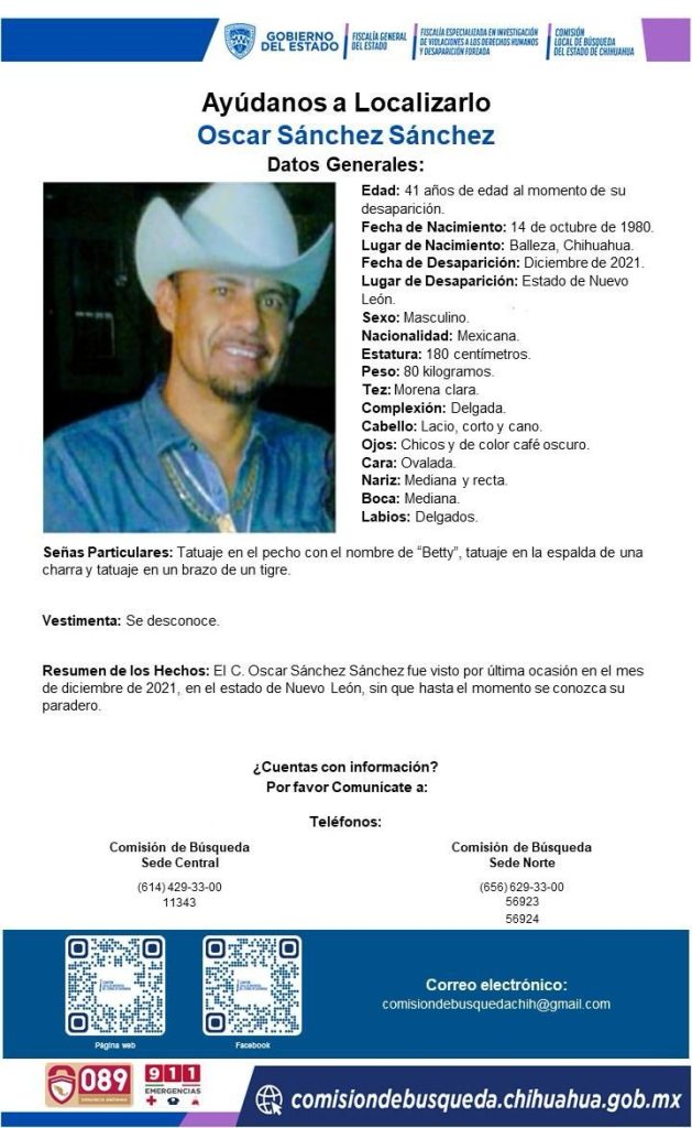 La Fiscalía solicita el apoyo de la ciudadanía para localizar a Óscar Sánchez Sánchez, originario de Balleza, Chihuahua, desaparecido en el estado de Nuevo León durante el mes de diciembre de 2021. Desde entonces no se tiene información sobre su paradero.