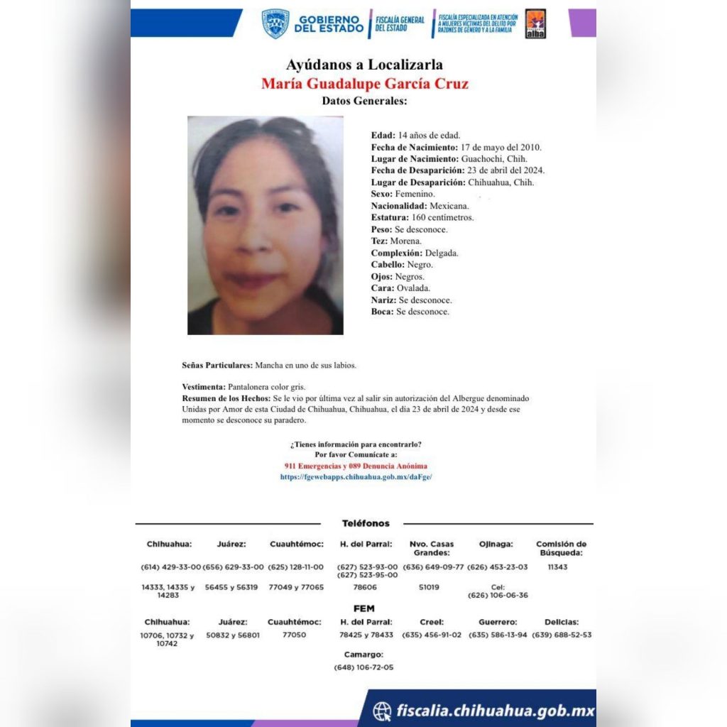 El pasado 23 de abril del 2024, María Guadalupe García Cruz, una joven de 14 años de edad, originaria de Guachochi, fue reportada como desaparecida, ya que salió sin autorización del Albergue “Unidas por Amor”, ubicado en la ciudad de Chihuahua, por lo que la Fiscalía General del Estado (FGE) mantiene vigente la pesquisa emitida para dar con su paradero.