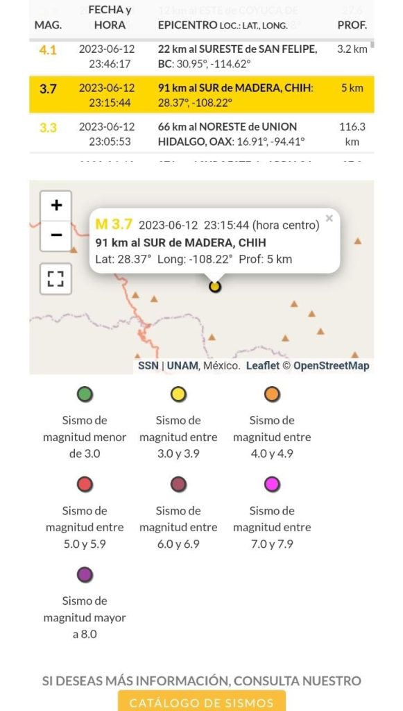 La Coordinación Estatal de Protección Civil (CEPC), dio a conocer que la noche de este lunes 12 de junio, se registró un sismo con magnitud de 3.7 grados en el municipio de Temósachic, de acuerdo con el reporte emitido por el Servicio Sismológico Nacional (SSN).