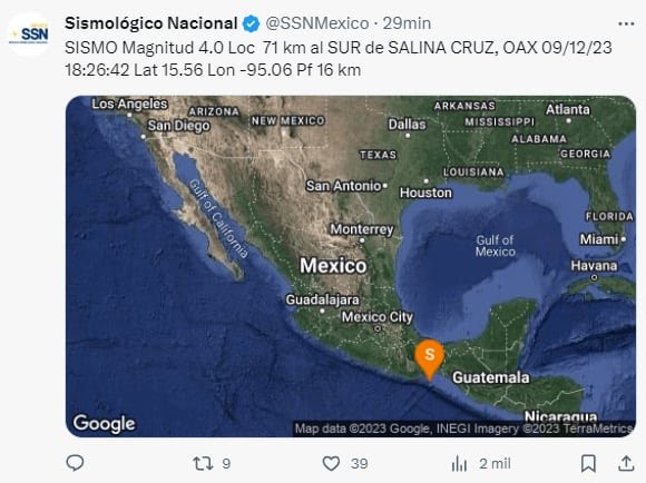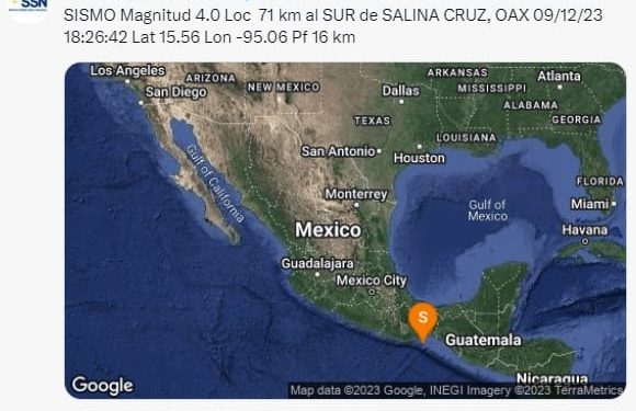 Se registró sismo con magnitud 4.0 localizado a 12 km al Oeste de Río Grande, Oaxaca, fue a las 13:57 horas.