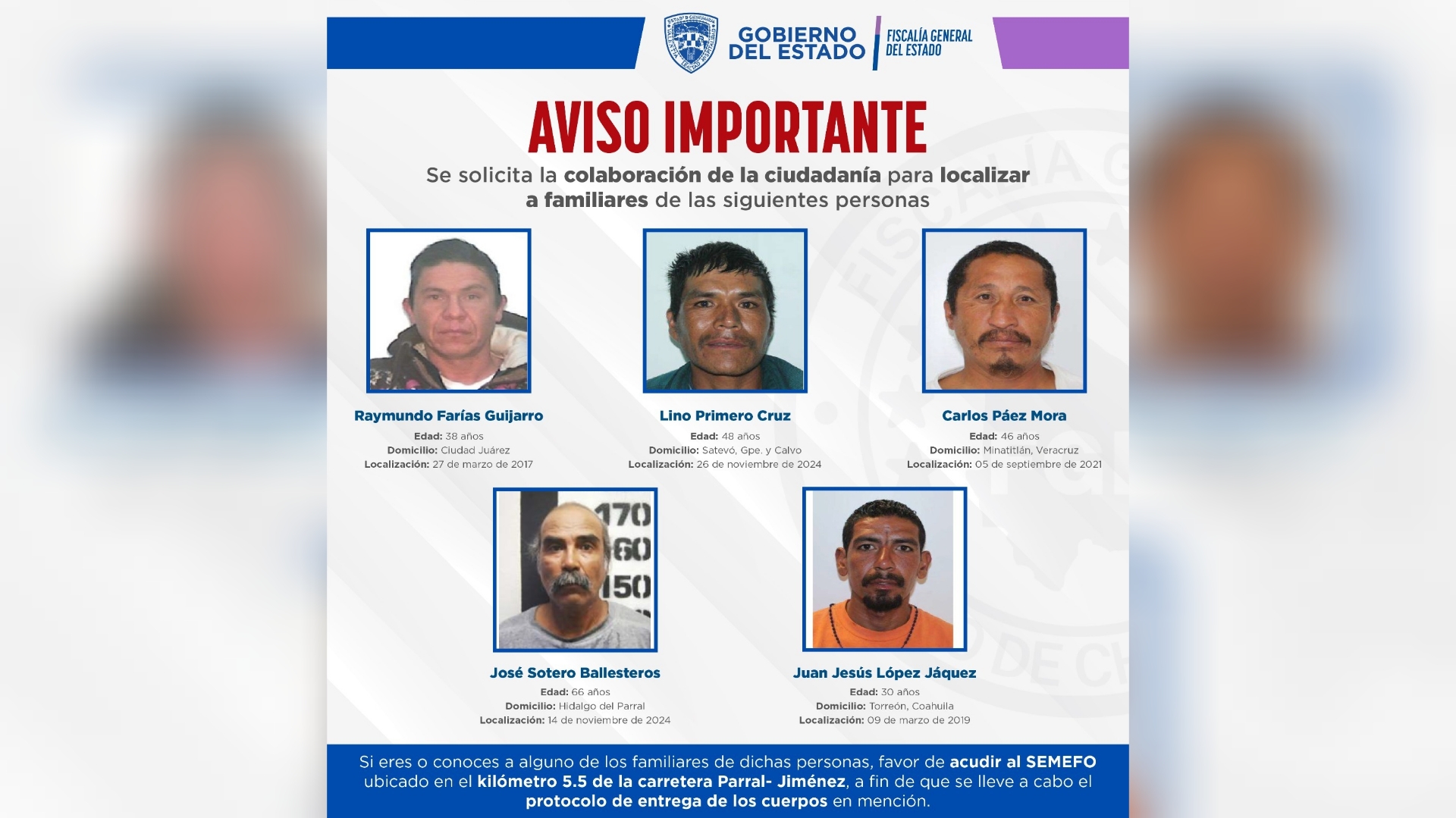 Si eres o conoces a alguno de los familiares de dichas personas, favor de acudir al SEMEFO ubicado en el kilómetro 5.5 de la carretera Parral- Jiménez, a fin de que se lleve a cabo el protocolo de entrega de los cuerpos en mención.
