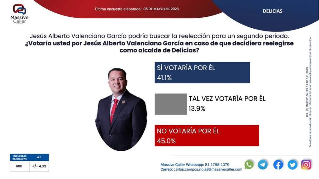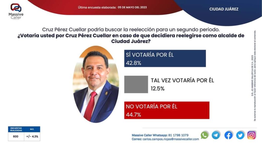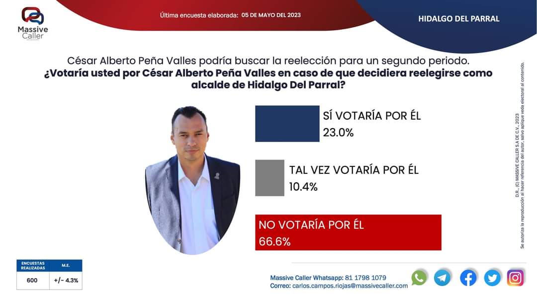 El sondeo muestra una disminución de la popularidad del presidente Municipal, César Peña Valles, para ubicarse en un 23%, lo que significa que apenas dos de cada diez parralenses votarían de nuevo por él en caso de que buscara reelegirse.