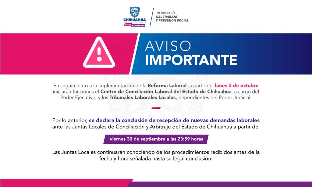 En seguimiento a la implementación de la Reforma Laboral, la Secretaría del Trabajo y Previsión Social (STPS) informó que la recepción de nuevas demandas laborales ante las Juntas Locales de Conciliación y Arbitraje del Estado de Chihuahua concluye hoy viernes 30 de septiembre a las 23:59 horas.