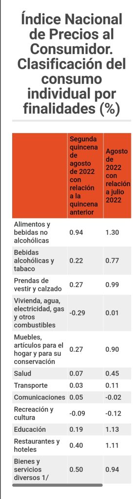 La inflación subyacente siguió incrementándose en agosto, ahora a un ritmo mensual de 0.80% y de 8.05% a tasa anual. Con 21 meses consecutivos al alza. Este componente se considera un mejor parámetro para estimar la trayectoria de la inflación en el mediano y largo plazo, debido a que excluye los precios más volátiles de la economía.