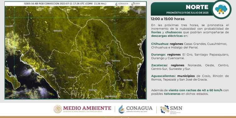 Asimismo, se prevén lluvias aisladas a dispersas para Juárez, Chihuahua, San Francisco de Borja, Satevó, Parral, Santa Bárbara, Saucillo, Allende, Jiménez, Camargo, Julimes, Aldama, Coyame y Ojinaga.