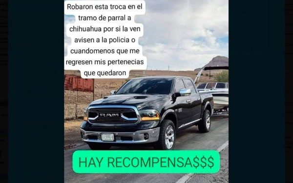 La mañana de este viernes, suejtos armados se robaron una Dodge RAM en la vía corta a Chihuahua, y sus propietarios ofrecen, a través de Facebook, una recompensa por recuperarla.