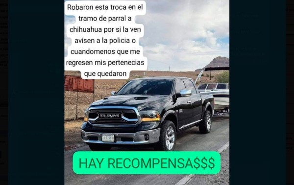 La mañana de este viernes, suejtos armados se robaron una Dodge RAM en la vía corta a Chihuahua, y sus propietarios ofrecen, a través de Facebook, una recompensa por recuperarla.