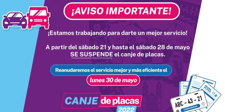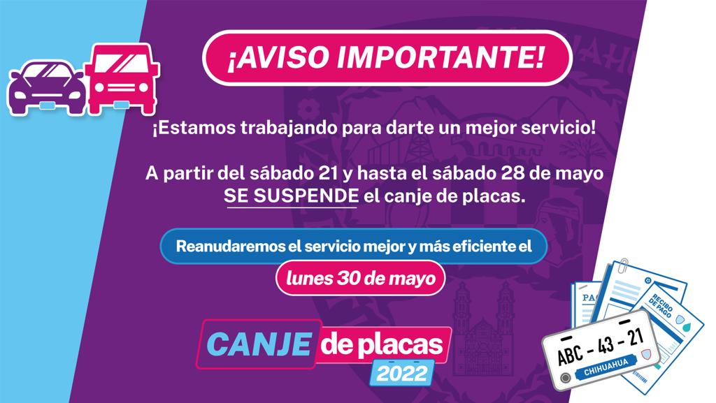El Gobierno del Estado por conducto de la Secretaría de Hacienda, anuncia que debido a la implementación de mejoras en la logística y mantenimiento de los sistemas informáticos a partir de mañana y durante toda la próxima semana, se suspende el trámite de canje de placas en todas las oficinas de la entidad.