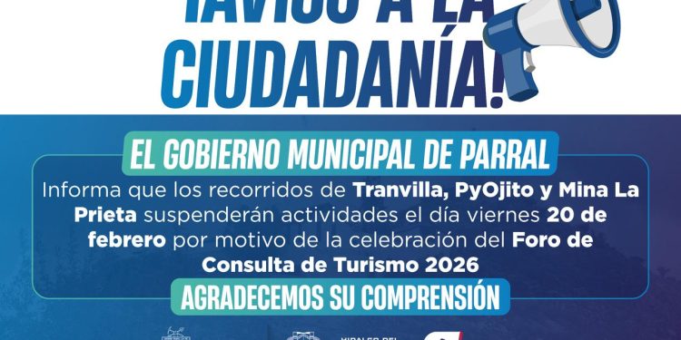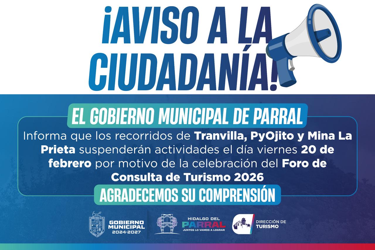 La Dirección de Turismo informa que este viernes se suspenderán temporalmente los servicios en la Mina La Prieta, el Museo Francisco Villa, el Tranvía Turístico y PyOjito, debido a la realización de la ceremonia de entrega de gafetes y reconocimientos del Curso de Guía Anfitrión.