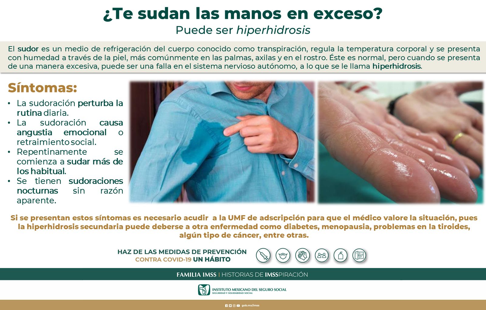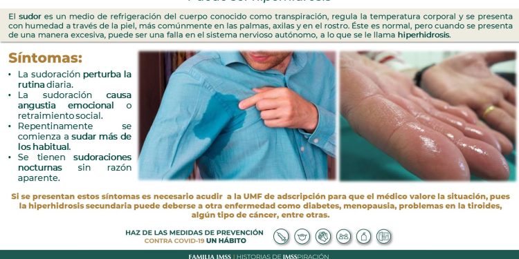 Por esto, el Instituto exhorta a los derechohabientes que presenten sudoración excesiva a acudir a su unidad de medicina familiar (UMF), para que el médico valore si es normal su situación en cuanto al sudor y en caso de encontrar anomalías, reciba el tratamiento adecuado para luchar contra este padecimiento, ya que este puede traer mucho estrés emocional dificultando la vida personal, laboral y social del paciente.