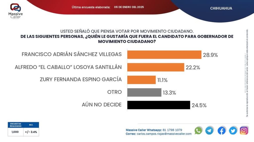 La más reciente encuesta de Massive Caller sobre las preferencias a la gubernatura de Chihuahua para 2027, arroja que, para el caso específico de Movimiento Ciudadano, el diputado local Francisco Adrián Sánchez Villegas aventaja al exalcalde de Parral, Alfredo Lozoya Santillán entre la militancia para que fuese el candidato.