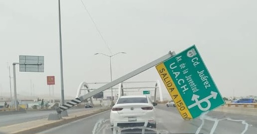 Un enorme letrero que señaliza rutas y nombres de avenidas en la ciudad de Chihuahua, cedió a la fuerza del viento y quedó a mitad de los carriles de circulación.
