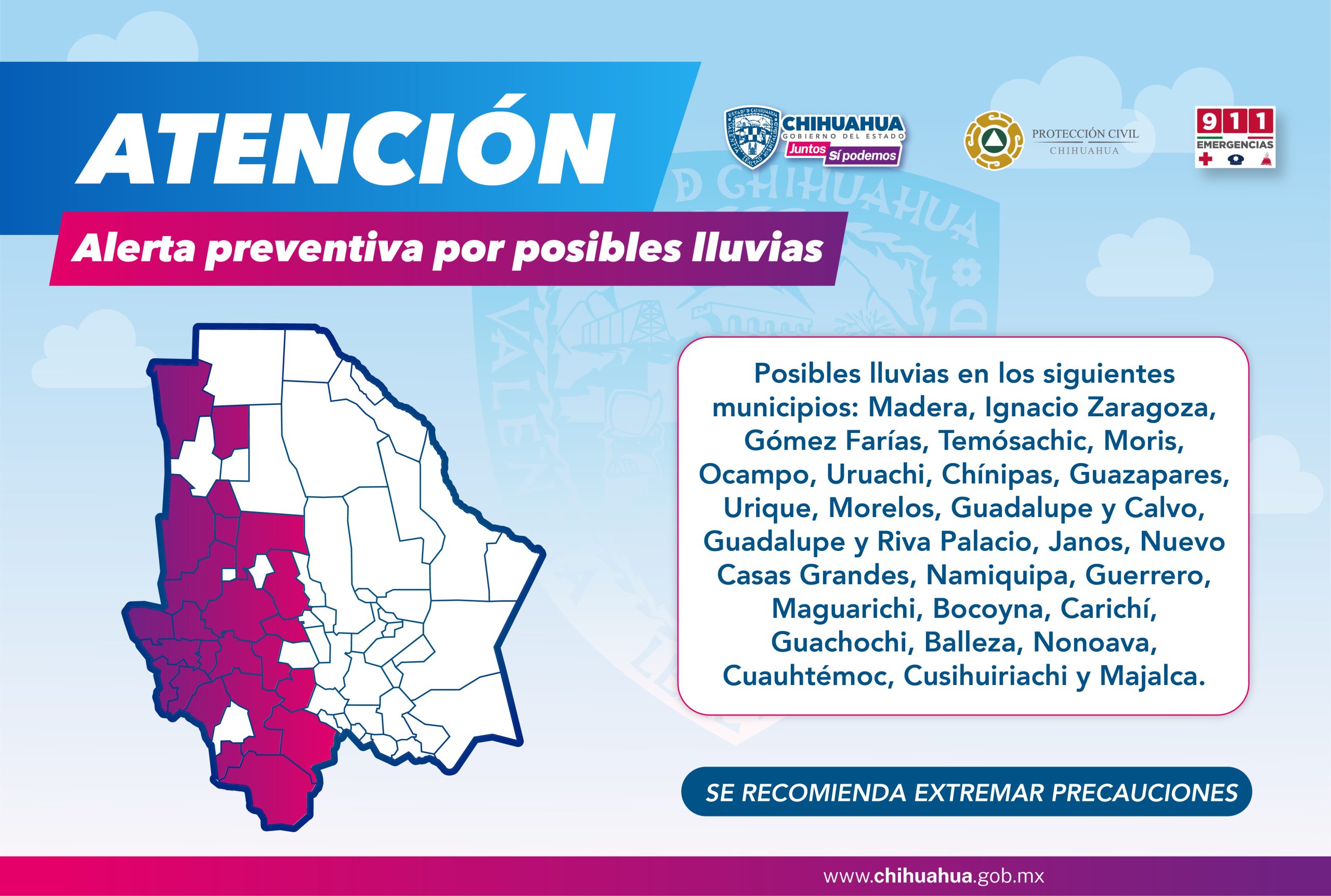 Con base a la información emitida por el Servicio Meteorológico Nacional (SMN), la CEPC informa que para esta tarde noche se prevé lluvias de moderadas a puntualmente fuertes con posible acumulación de 25.1 a 50 milímetros (mm) en los municipios de Moris, Chínipas, Guazapares, Urique, Batopilas, Morelos, Guadalupe y Calvo, Janos, Casas Grandes, Madera, Ocampo, Uruachi, Maguarichi, Bocoyna, Carichí, Guachochi y Balleza.