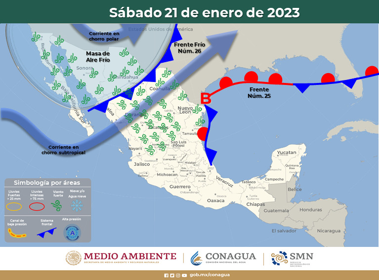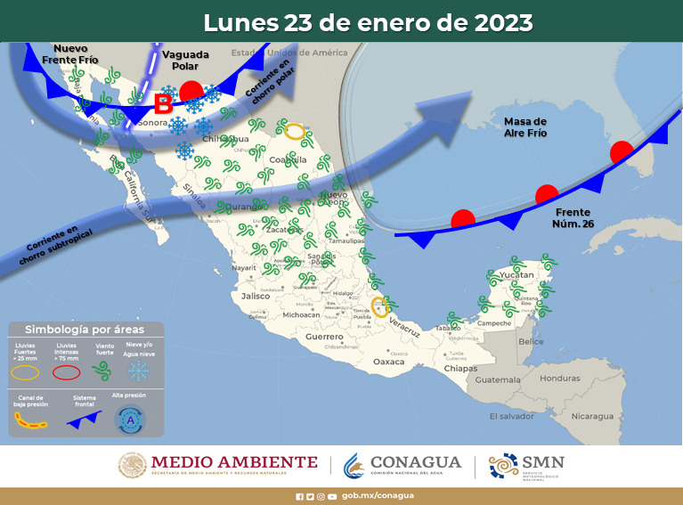 Mientras el pronóstico del próximo lunes 23 de enero, indica que se espera el ingreso del frente frío número 27 a la entidad lo que favorecerá un ambiente muy frío por la mañana y noche.