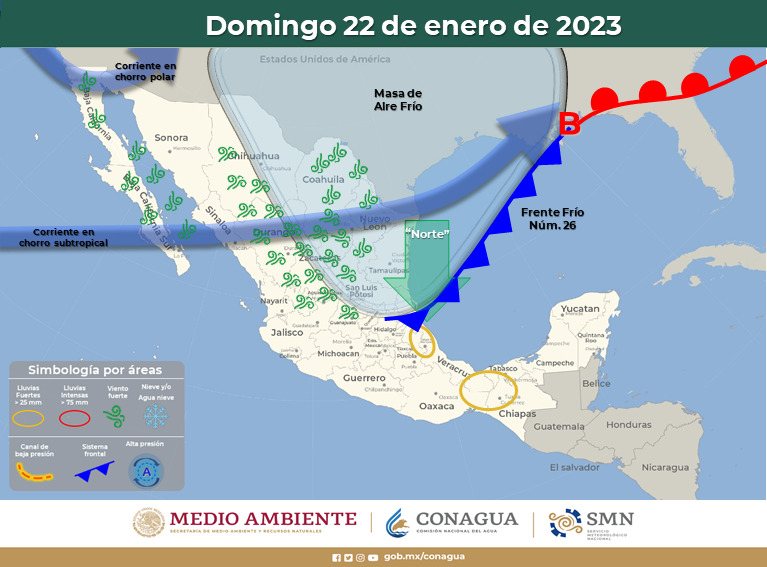 La Coordinación Estatal de Protección Civil (CEPC), indicó que, para este viernes 20 de enero, el ingreso del frente frio número 26 provocará un descenso marcado en las temperaturas en gran parte del estado, además de la posibilidad de presencia de nieve, aguanieve durante el inicio de semana y fuertes rachas de viento.
