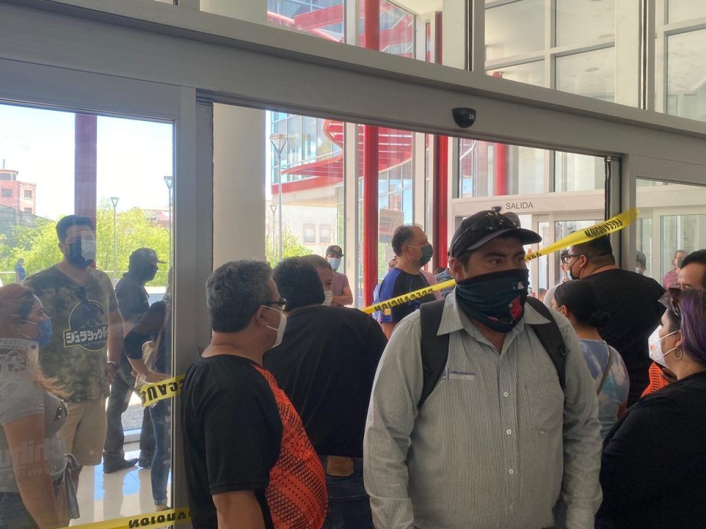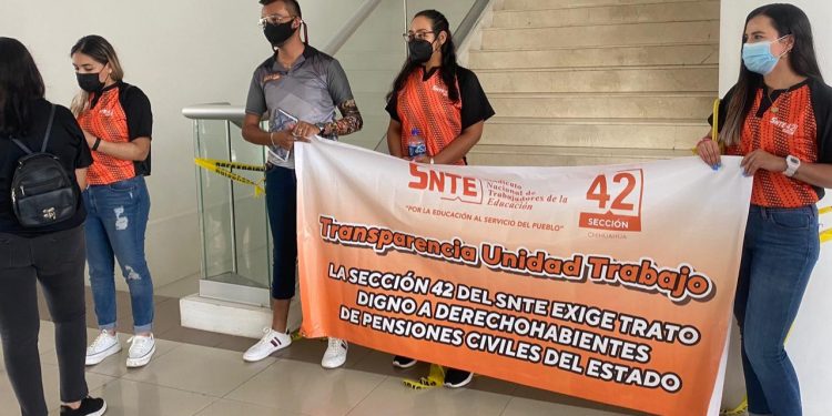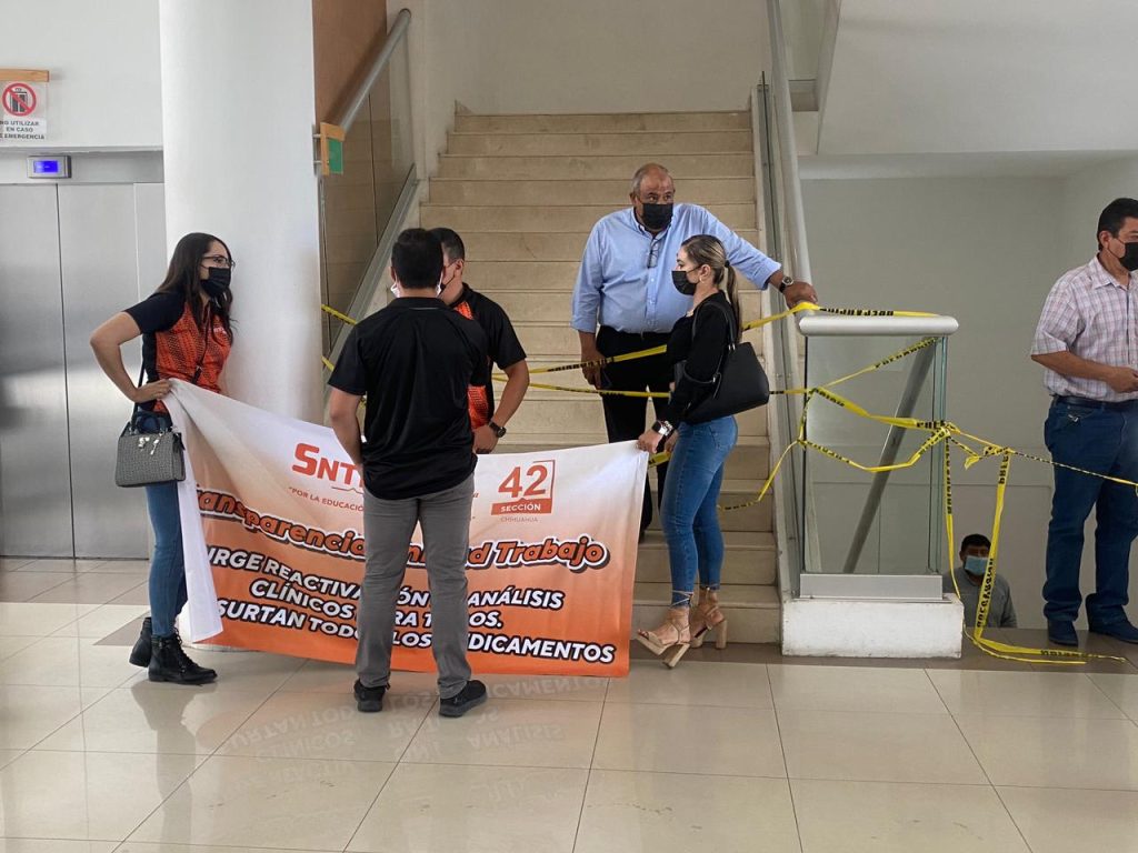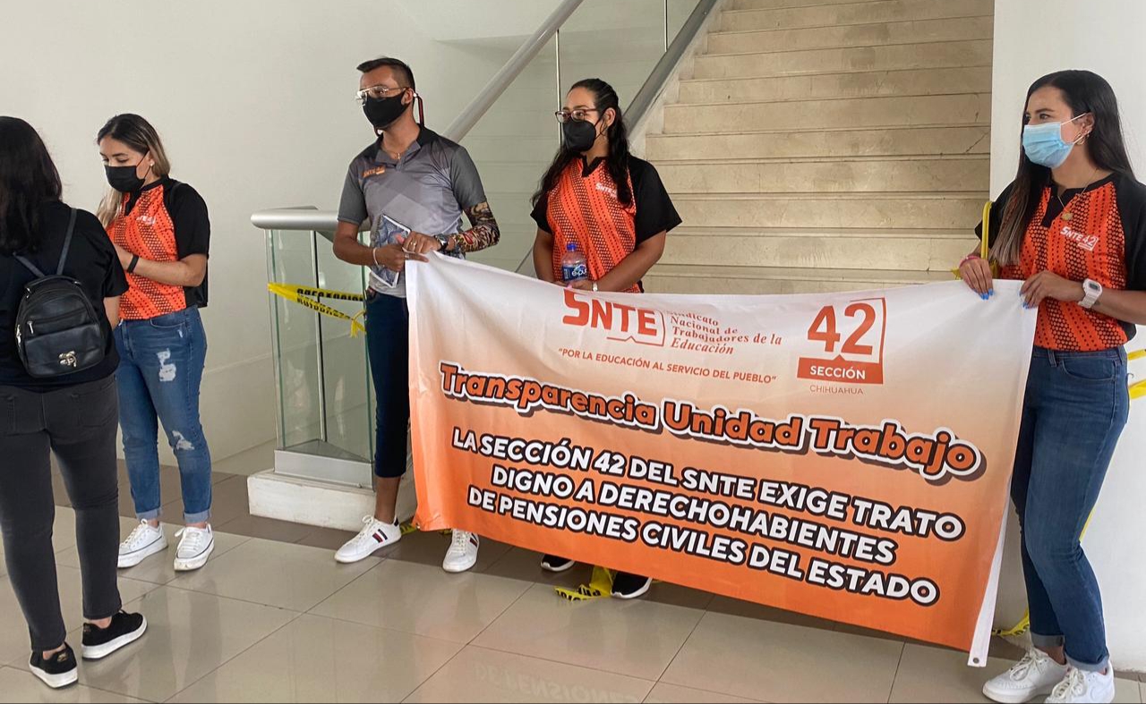 Una comitiva de docentes pertenecientes a la Sección 42 del SNTE, así como empleados sindicalizados de la Junta Municipal de Agua y Saneamiento, tomaron esta mañana las instalaciones del edificio de Gobierno ubicado en la avenida 20 de noviembre, exigiendo se resuelvan las deficiencias del servicio médico de Pensiones Civiles del Estado.