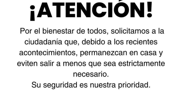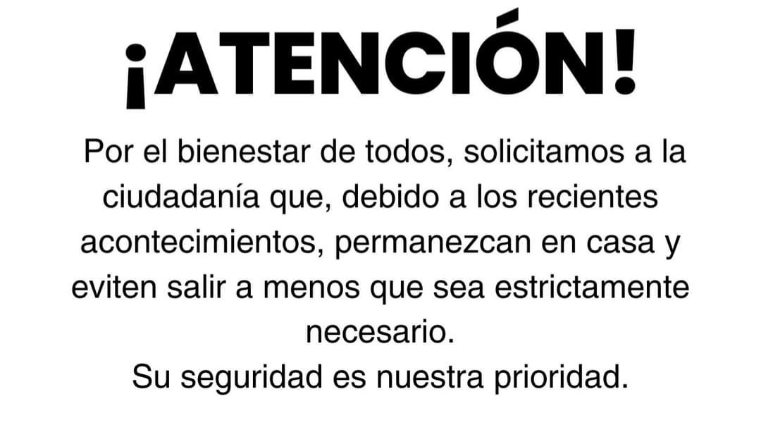 «Por el bienestar de todos, solicitamos a la ciudadanía que, debido a los recientes acontecimientos, permanezcan en casa y eviten salir a menos que sea estrictamente necesario», se lee en el mensaje que difundieron a través de la página oficial del gobierno local.