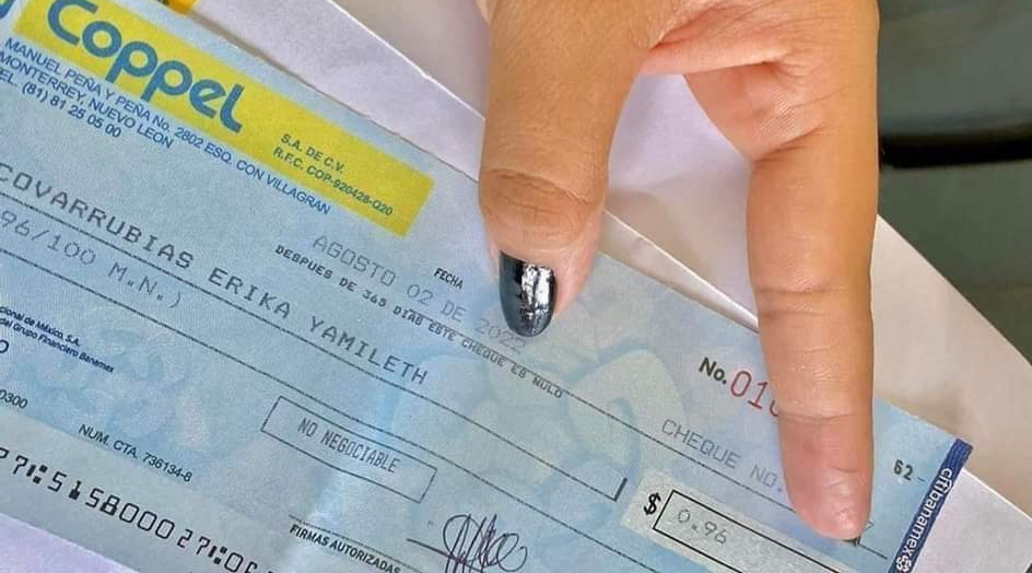 ¡Y es que su cheque de finiquito le llegó por la cantidad de 96 centavos!