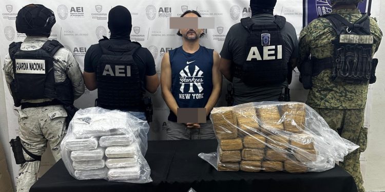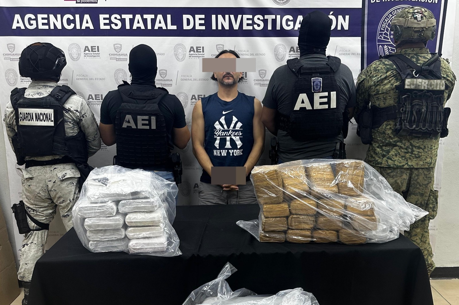 Elementos de la Agencia Estatal de Investigación, con apoyo de la Guardia Nacional y del Ejército Mexicano, detuvieron a un masculino que se identificó como Daniel Guillermo S. B., por su presunta responsabilidad en delitos contra la salud, cometido en Ciudad Juárez.