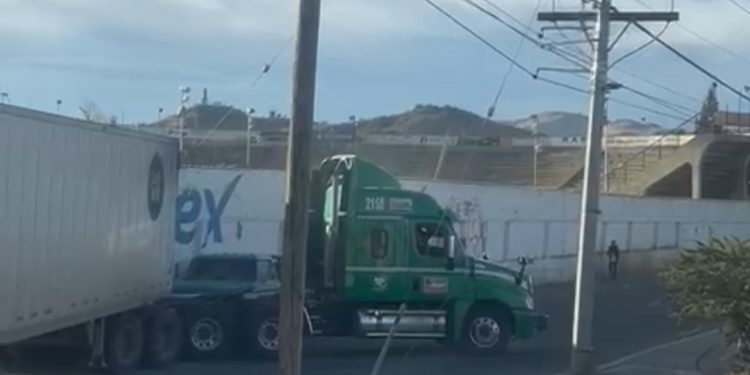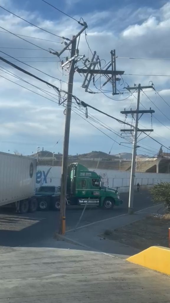 La pesada unidad porta un logotipo y razón social de una empresa de carga de Nuevo León y el conductor dijo estar a la espera de que llegue el ajustador de seguros para deslindar responsabilidades junto a las autoridades viales y de la Comisión Federal de Electricidad.