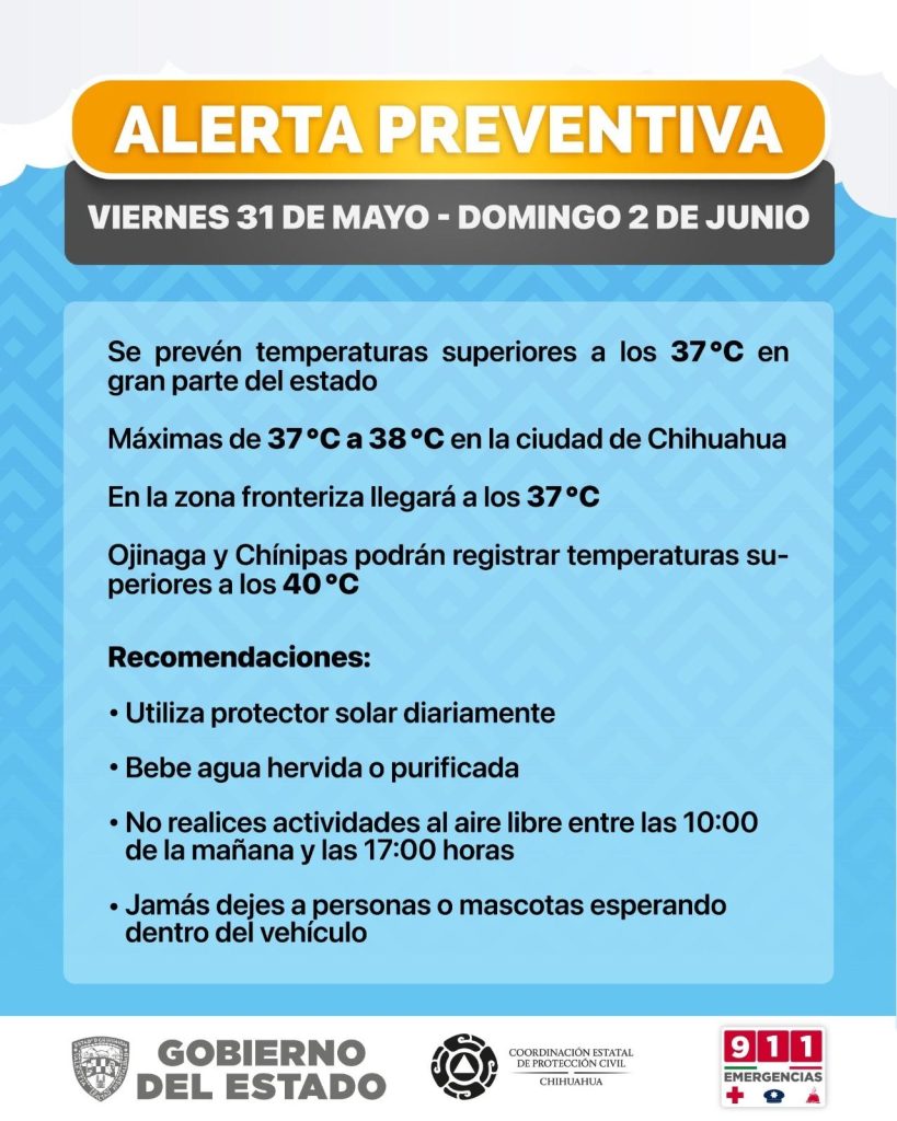 Para la ciudad de Chihuahua se esperan máximas de 37°C durante esta tarde de viernes, y de hasta 38°C durante el fin de semana, condiciones similares a las previstas para la región fronteriza.