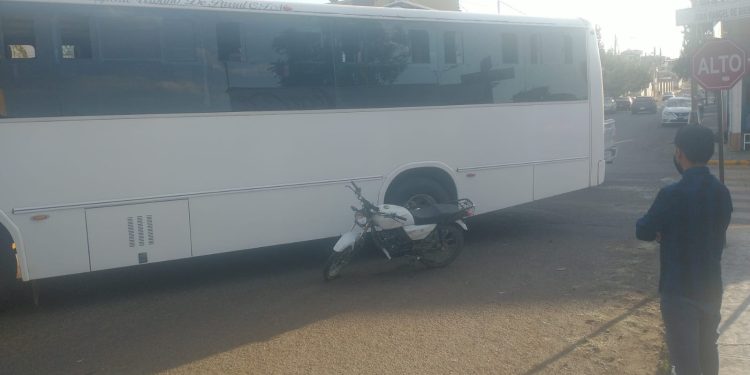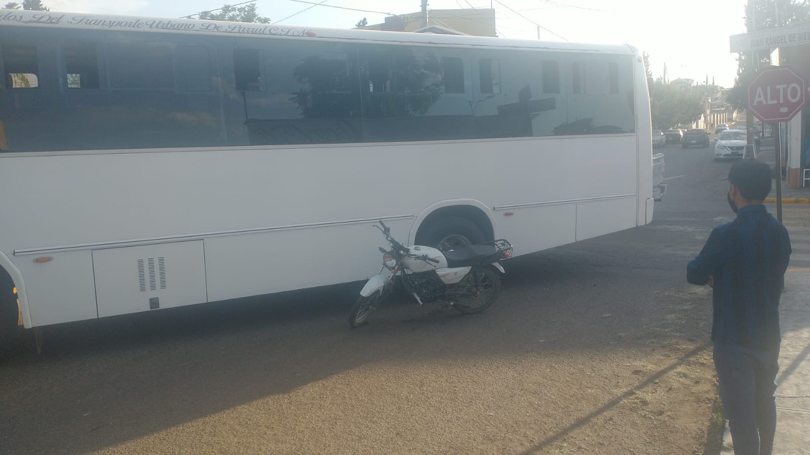 No respetar el espacio de un camión urbano para realizar su vuelta amplia, ocasionó que un motociclista fuera impactado por la pesada unidad en la intersección de las calles Juan Rangel de Biezma y Tercera.