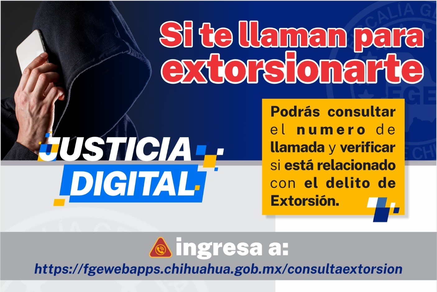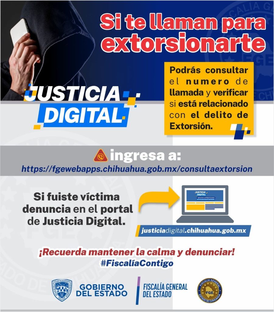En un esfuerzo de la Fiscalía General del Estado por brindarle a los chihuahuenses, mecanismos de prevención para combatir los delitos que afectan su patrimonio, como son las extorsiones a través de llamadas telefónicas, se puso en marcha una aplicación Web en la dirección: https://fgewebapps.chihuahua.gob.mx/consultaextorsion