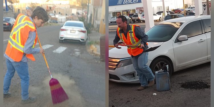 El regidor Vicencio Chávez volvió a intervenir directamente en las calles de Parral, ahora con trabajos de bacheo realizados —según informó— con recursos propios y acompañado de su hijo mayor.