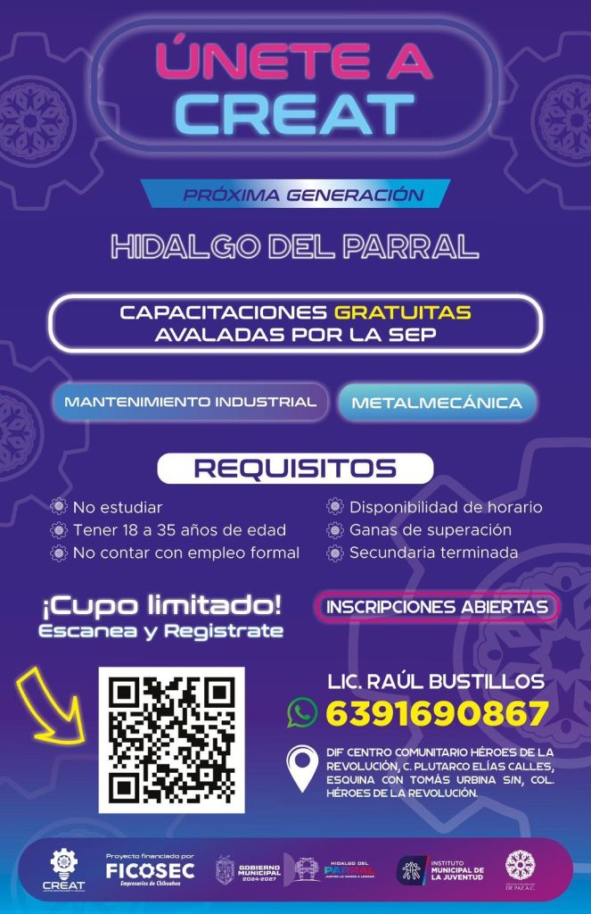 El Gobierno de Parral, encabezado por el alcalde Salvador Calderón, presentó oficialmente el programa CREAT, una estrategia enfocada en brindar herramientas de desarrollo personal y técnico a jóvenes de 18 a 35 años, en condición de vulnerabilidad y fuera del sistema educativo formal.