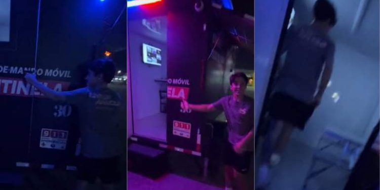 El video compartido muestra como, en compañía de otros dos, abrieron sin autorización el centro de mando móvil del sistema de vigilancia Centinela del Gobierno del Estado que se encuentra en dicha plaza comercial.