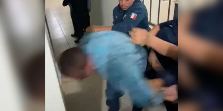 Entre tres uniformados que tienen sometido a un hombre identificado como Javier Trejo Flores, del cual se desconocen los motivos de su detención, pero en el video se aprecia que, a pesar de tenerlo sometido, uno de los agentes lo obliga a soltarse de una reja a la que se sujetaba para impedir que lo movieran a otro sitio y, torciéndole el brazo, hace que el señor Trejo Flores se estrelle de cabeza contra la pared.