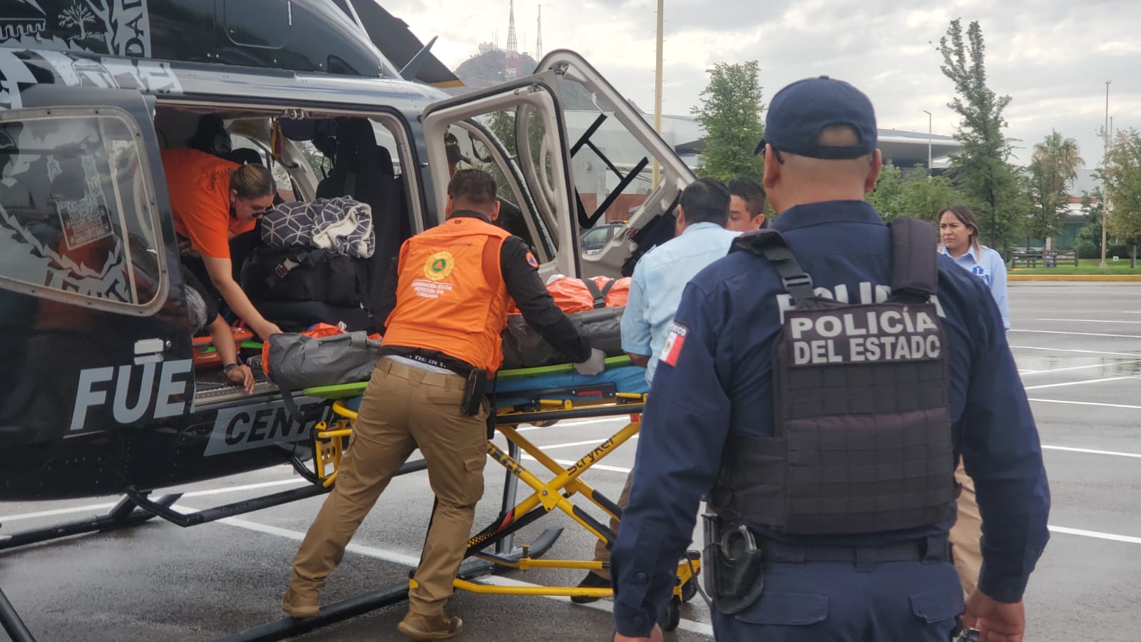 Personal de la Unidad de Rescate de Gobierno del Estado (URGE), dirigió las labores de apoyo vía terrestre, desde el arribo del joven al estacionamiento del Centro de Convenciones de la ciudad de Chihuahua, hasta el nosocomio.