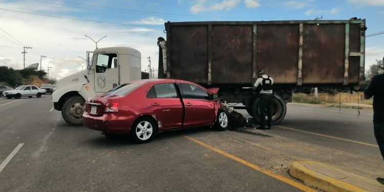 Un aparatoso accidente se registró la tarde de este sábado en la Vía Corta a Chihuahua, donde un vehículo compacto y un camión de carga protagonizaron un choque que dejó como saldo un joven lesionado y cuantiosos daños materiales.