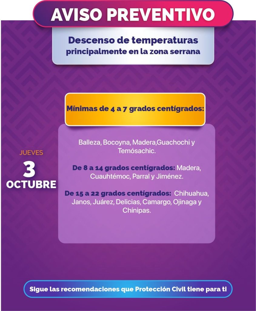 La Coordinación Estatal de Protección Civil (CEPC) dio a conocer que, durante las primeras horas del jueves 3 y viernes 4 de octubre, se prevé un ligero descenso en las temperaturas en municipios de la Sierra Tarahumara, así como lluvias ligeras.