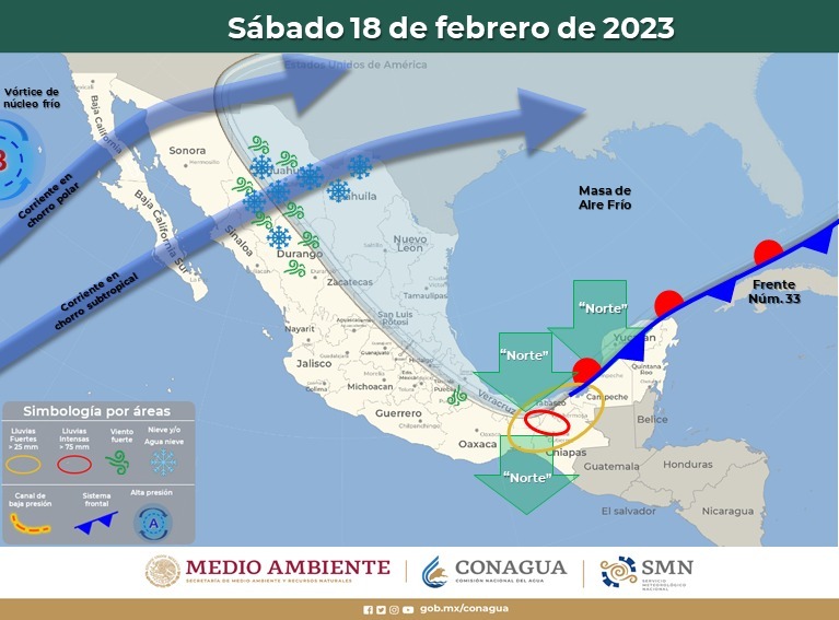 Estas precipitaciones podrán estar acompañadas de caída de agua nieve y nieve en las partes altas de la Sierra, como en Madera, Basaseachi, Creel, San Juanito, Guachochi, Balleza, Guadalupe y Calvo y El Vergel; también se pronostica posible potencial de agua nieve en Janos, Cuauhtémoc y Majalca.
