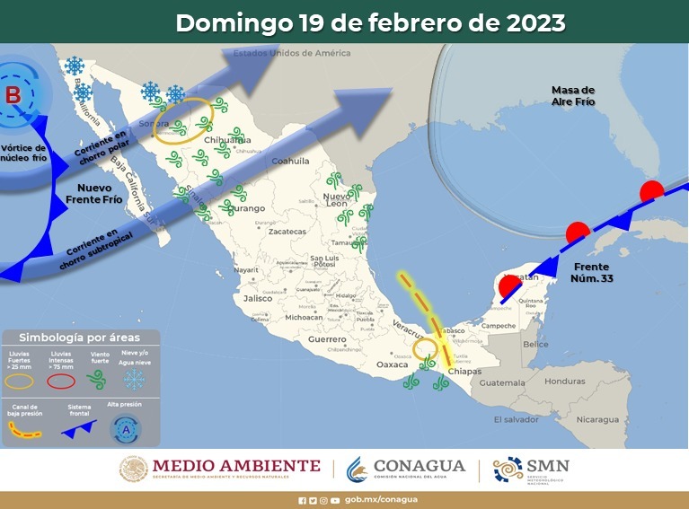 Las lluvias serán durante el día y noche del domingo, y parte de la madrugada del lunes 20, de dispersas a moderadas en Juárez, Ascensión, Casas Grandes y Madera; de aisladas a dispersas en Guadalupe, Ahumada, Nuevo Casas Grandes, Galeana, Ignacio Zaragoza, Gómez Farías y Namiquipa, las cuales pueden estar acompañadas de caída de agua nieve y nieve en las partes altas de la sierra. Posible nieve: Madera; Posible aguanieve en: Janos, Casas Grandes y Majalca.