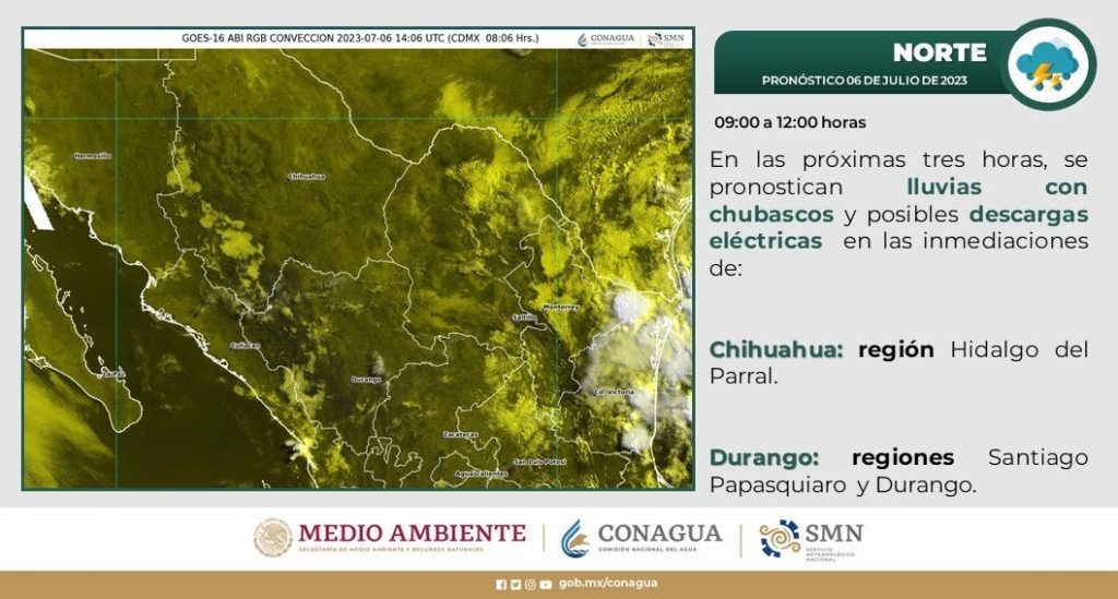 Para el viernes 7 de julio las condiciones de lluvia se harán presentes de forma aislada, con intervalos de chubascos de 2.1 a 5 mm en Batopilas, Guadalupe y Calvo, Ascensión, Janos, Casas Grandes, Madera, Temósachic, Ocampo, Guerrero, Bocoyna, Guachochi y Balleza.