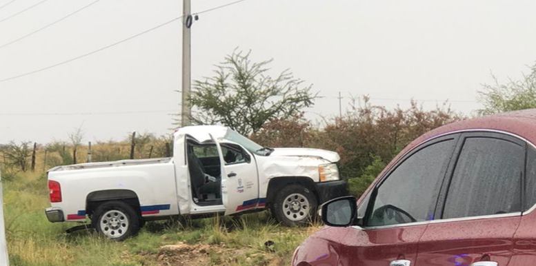 Exactamente en el entronque a Talamantes, la unidad oficial, una Chevrolet Silverado de Gobierno del Estado, asignada a la Secretaría de Educación y Deporte, salió del camino para quedar en su posición original tras dar vueltas.