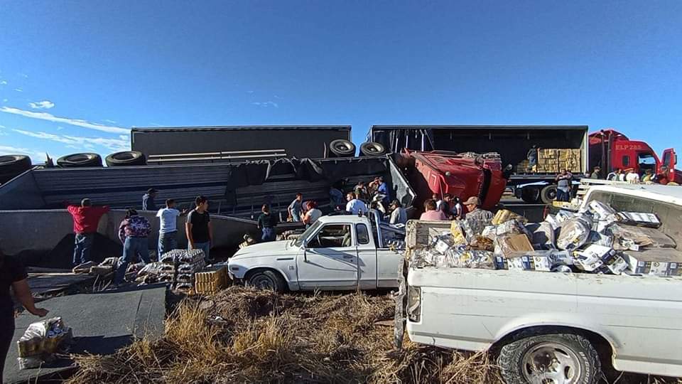 Un tráiler con dos remolques cargados con miles de botellas de cerveza volcó en el lilómetro 193 de la carretera que conecta Delicias con Chihuahua a las 2 de la madrugada.