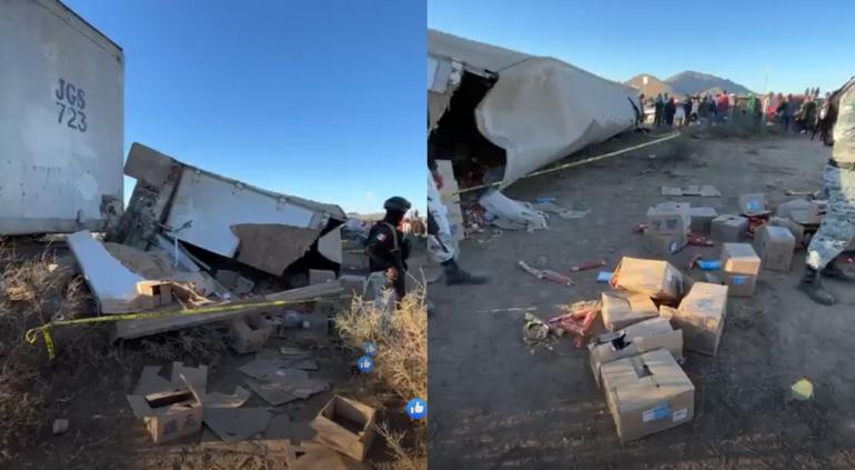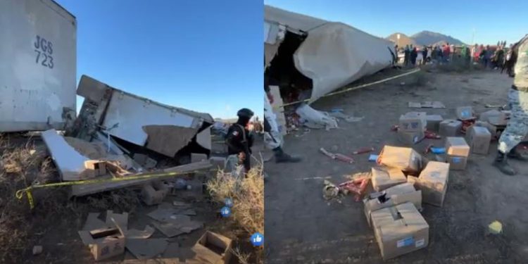 La mañana de este lunes, sobre la carretera Jiménez-Torreón, un tractocamión doble remolque cargado con empaques de galletas, sufrió un accidente automovilístico cuando el conductor perdió el control del volante terminado por salirse del camino.