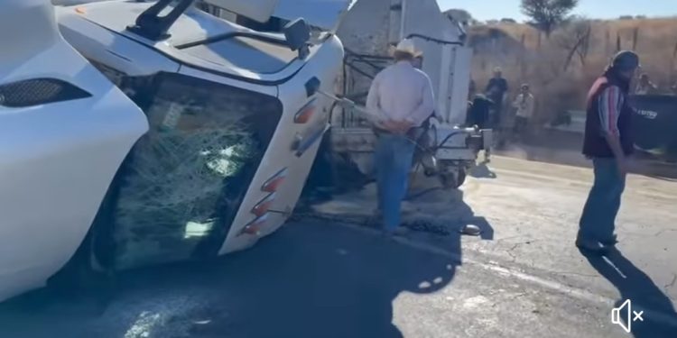 Esta mañana, un tractocamión blanco que cargaba salvado de trigo, volcó sobre la carretera a Santa Bárbara, a la altura de El Granillo.